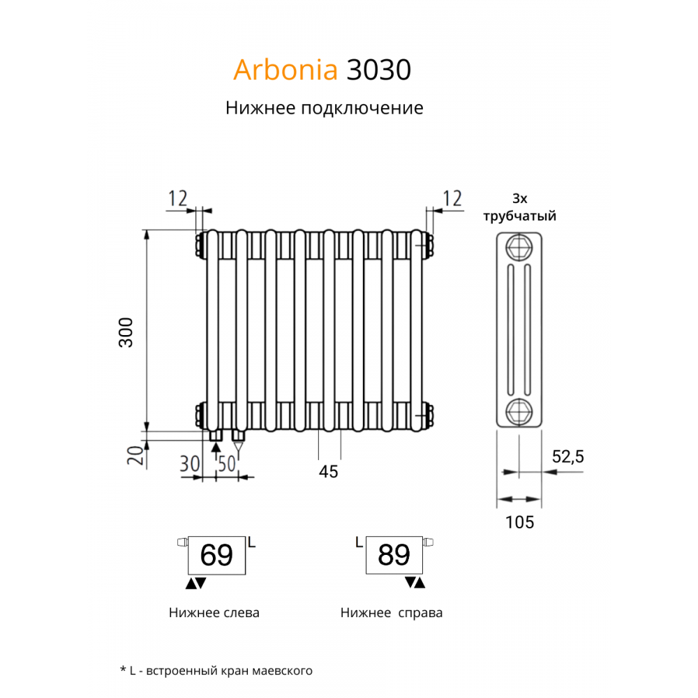 | Подключение | Нижнее со встроенным вентилем вверху №69/№89 |